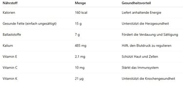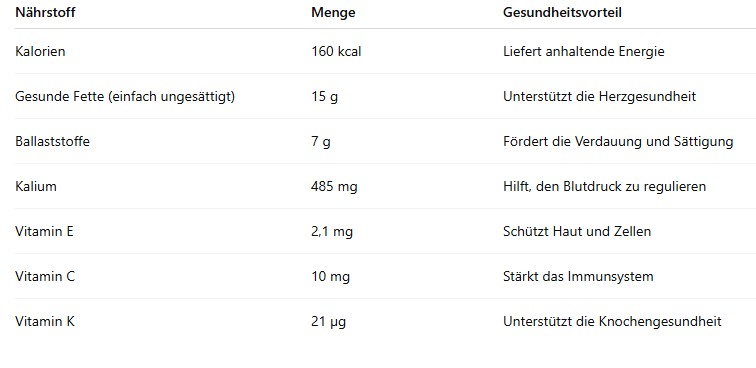 Hier ist die Tabelle mit den Nährwertangaben für Avocados (pro 100-g-Portion).